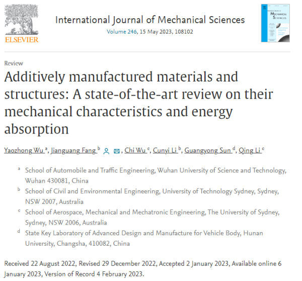 武科大网讯 近日,我校汽车与交通工程学院吴耀中博士应邀以国产亚洲精品久久久久久久_无码AV免费精品一区二区三区_99久久久无码国产精品免费人妻_精品人妻无码一区二区三区在线_无码专区久久综合久综合字幕_久久精品国产一区二区三区四区_真实一级一级一片免费视频_特级精品毛片免费观看_国产成人无码AA片免费看为第一单位,以第一作者在机械工程领域Top期刊International Journal of Mechanical Sciences(2021年影响因子:6.772,中科院一区top)发表题为《Additively manufactured materials and structures: A state-of-the-art review on their mechanical characteristics and energy absorption》的综述论文。论文通讯作者为悉尼科技大学方剑光博士,其他合作者包括悉尼大学Li Qing教授、湖南大学孙光永教授。