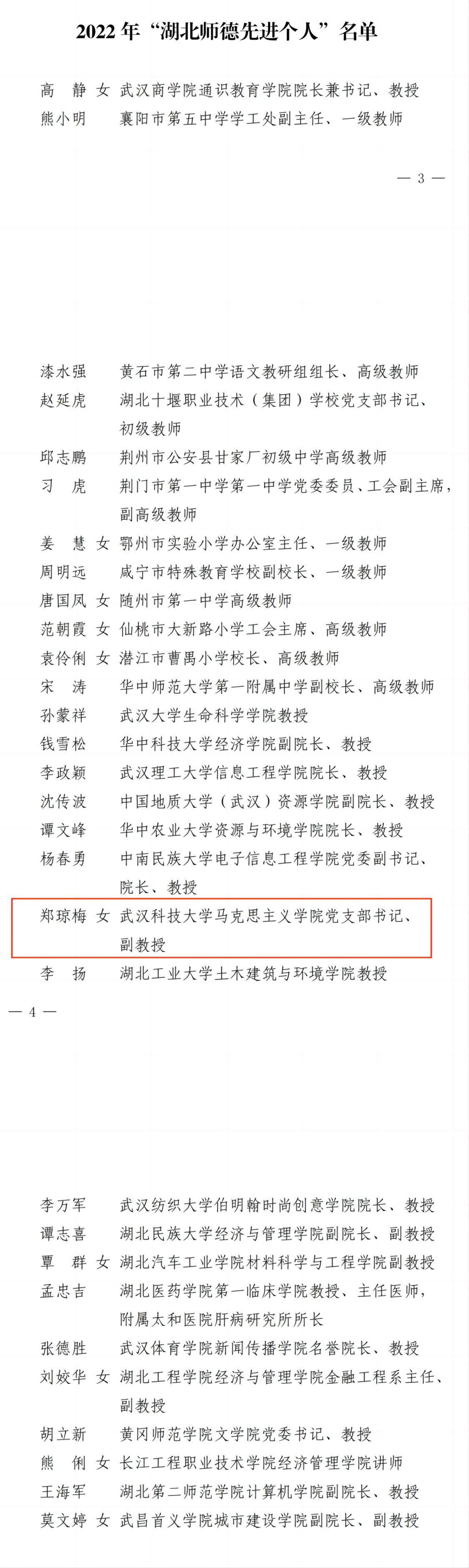 武科大网讯(记者陈孖川)近日,湖北省教科文卫体工会公布了2022年湖北省“十佳师德标兵”和“师德先进个人”评选结果,我校马克思主义学院副教授郑琼梅荣获2022 年“湖北师德先进个人”。