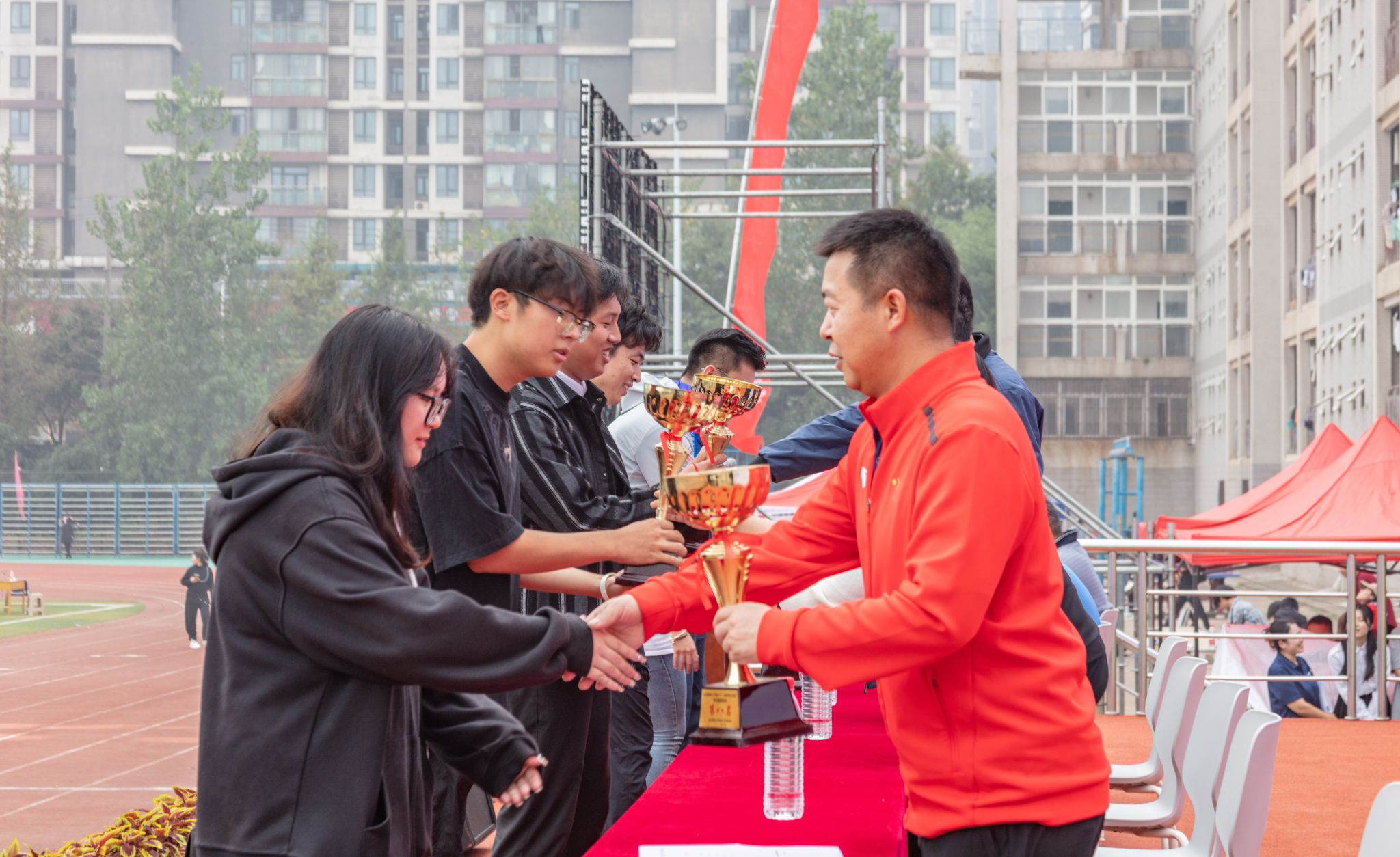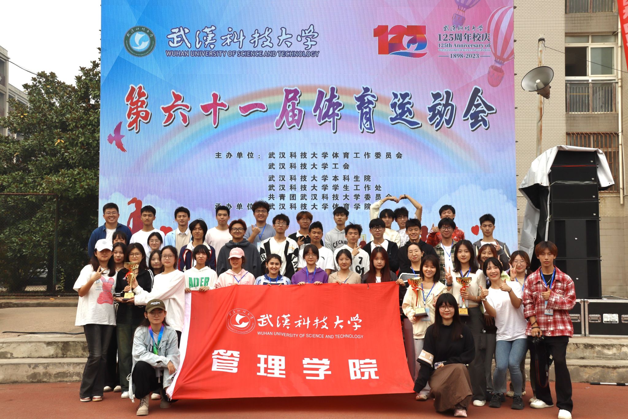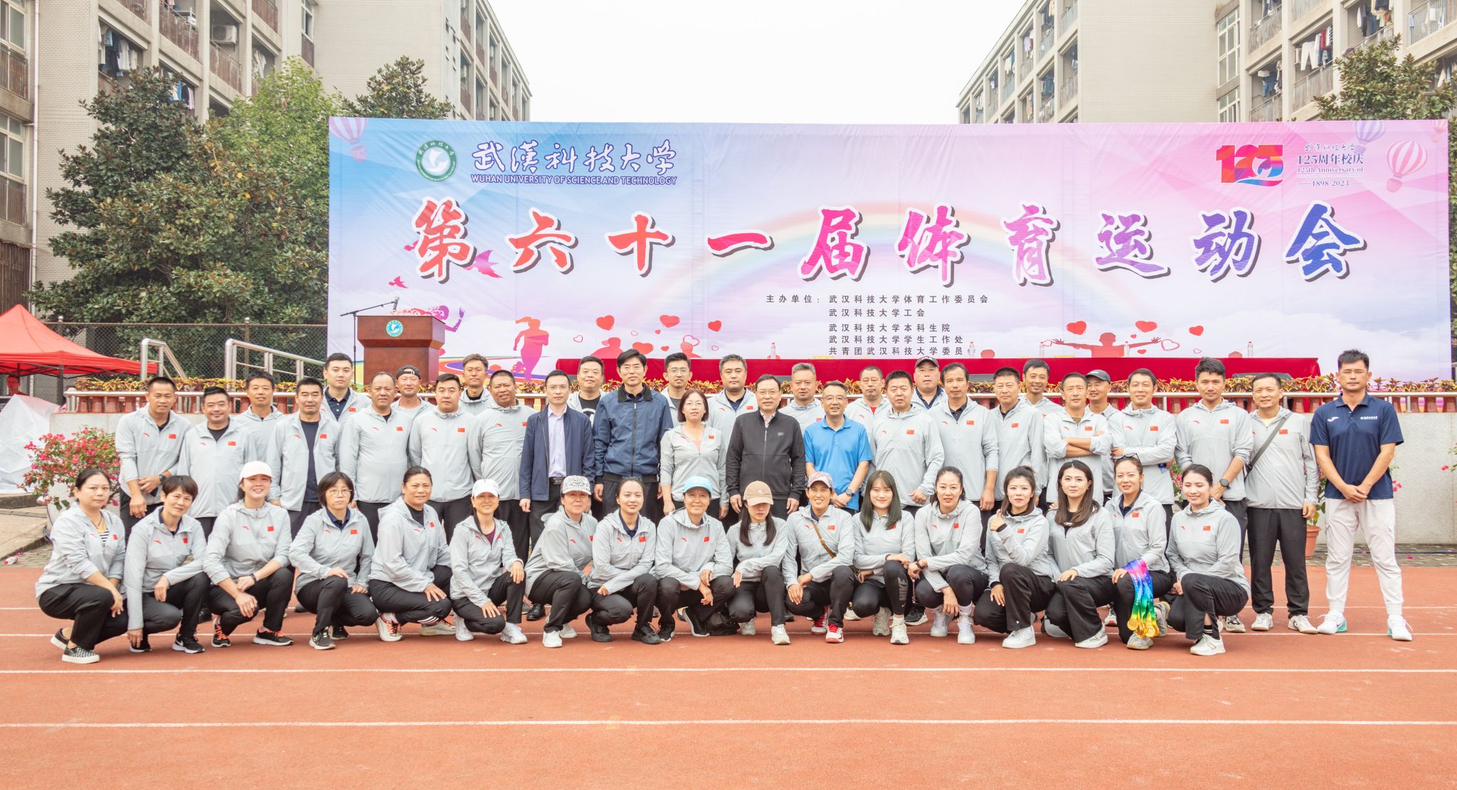 10月28号上午十一点,我校在南苑操场举行第六十一届体育运动会闭幕式。闭幕式上,第一项由运动会赛事主管敖德江宣布竞赛结果,第二项学生工作处处长许立桥老师宣布“体育道德风尚奖”评比结果,第三项体育学院副院长王路遥老师宣布“组织贡献奖”获奖单位,第四项党委宣传部常务副部长饶红亮老师宣布“最美人气方阵”,第五项为领奖仪式。颁奖结束后,老师团体以及学院方阵合影留念。(潘梦颖)