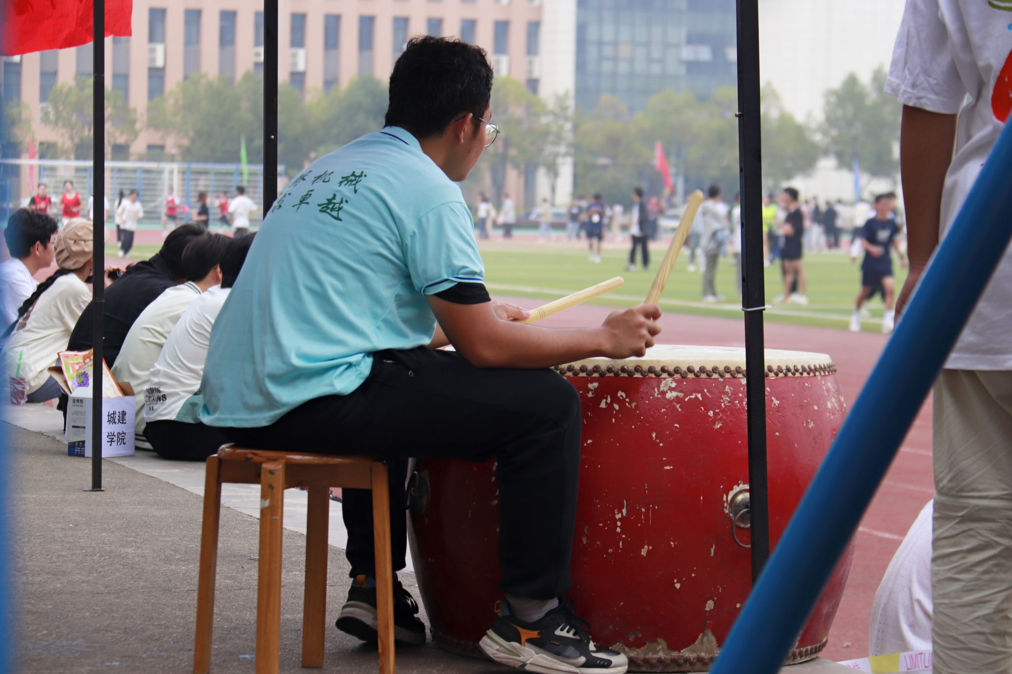 机械学院击鼓为运动员加油 郭劼摄