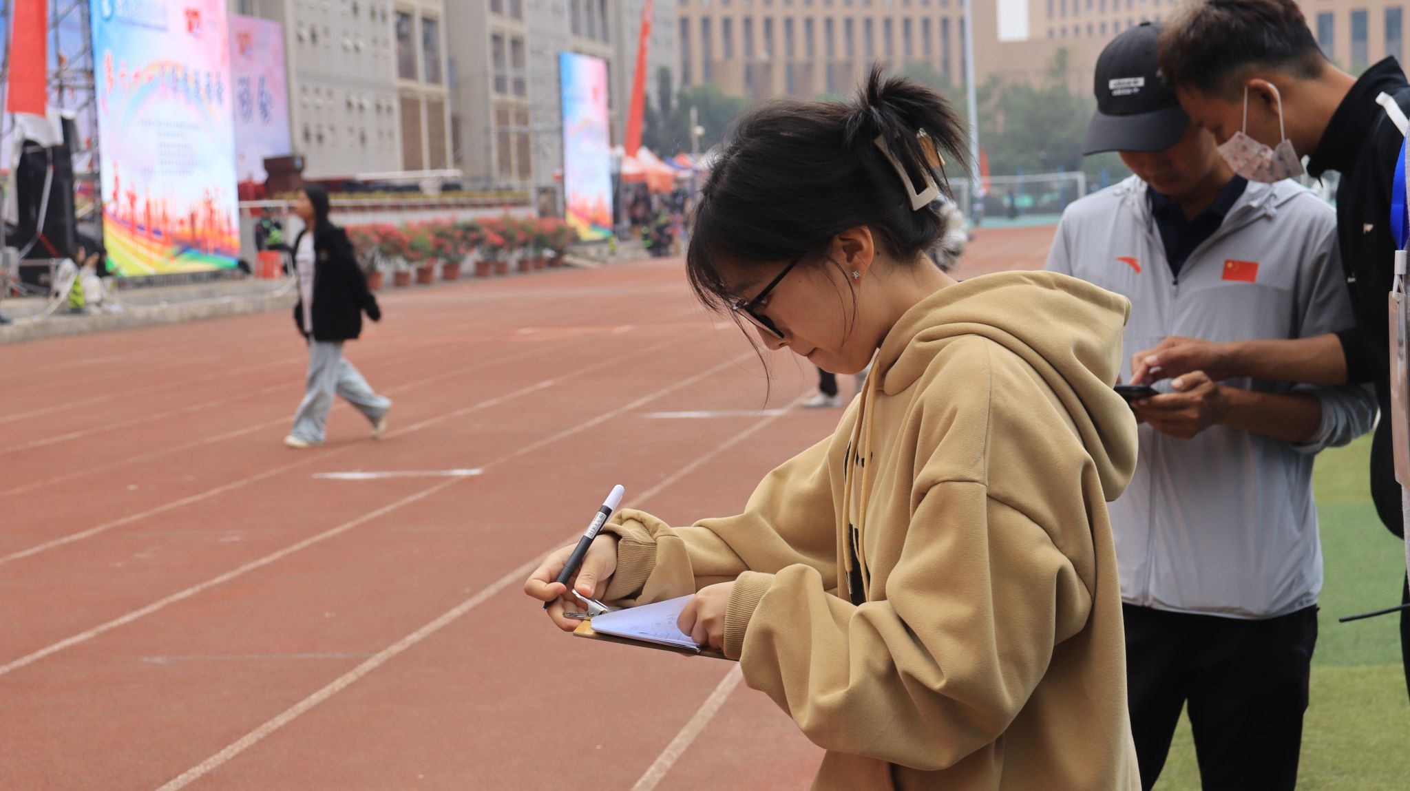 管院志愿者为运动员加油 郭劼摄