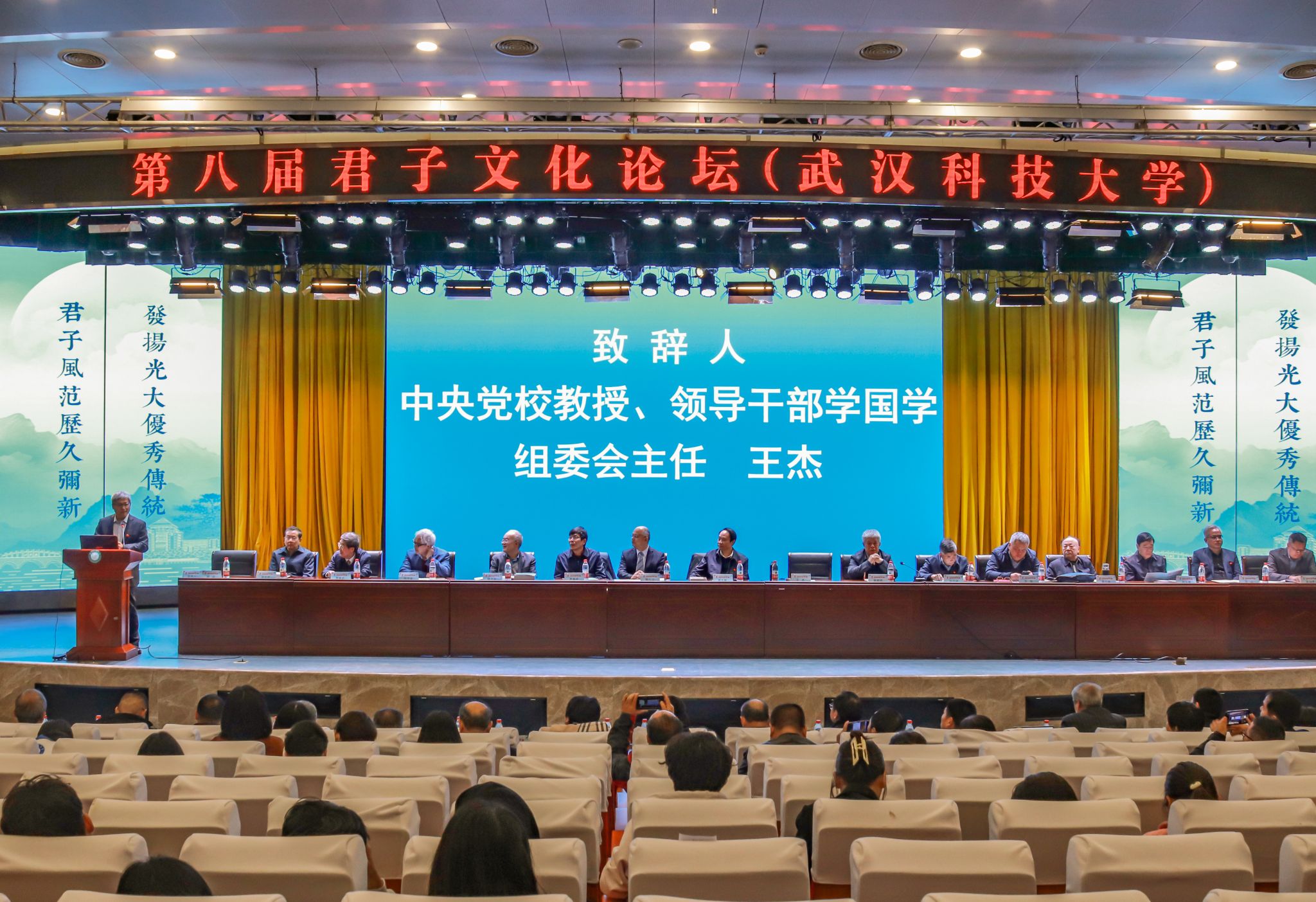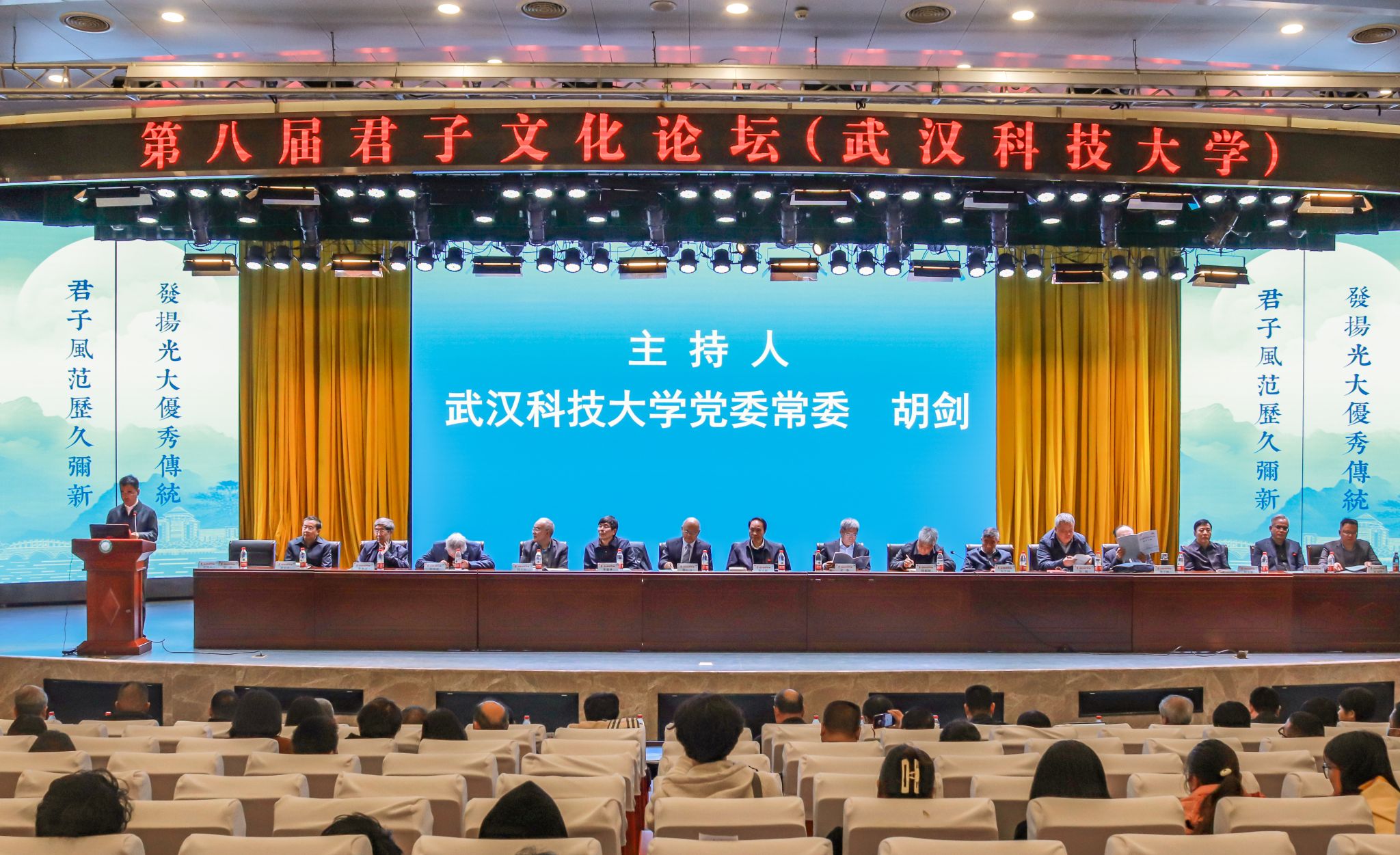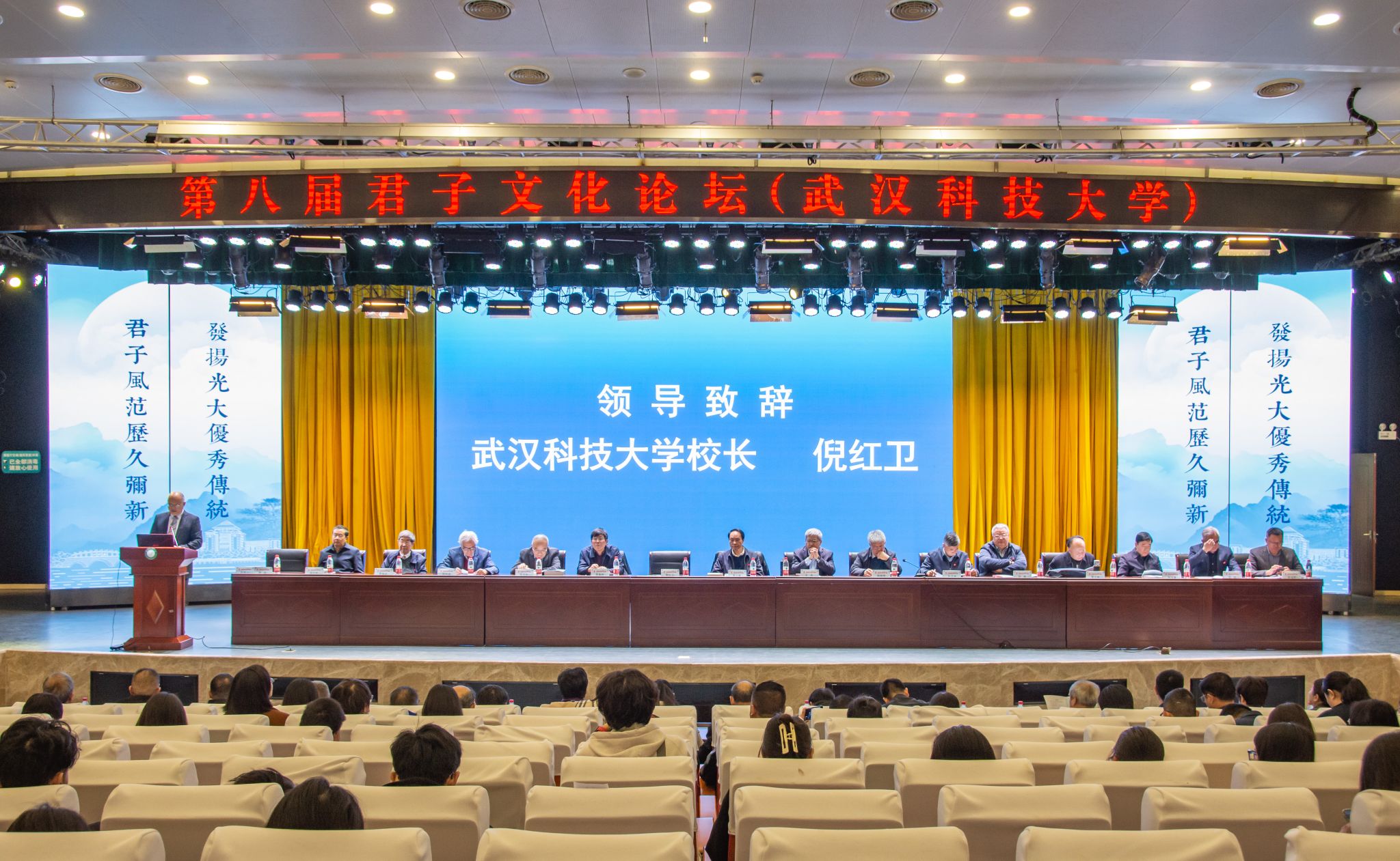 君子风范历久弥新,发扬光大优秀传统。11月11日,第八届君子文化论坛开幕式在我校青山校区钢铁楼碧园会堂召开,本次论坛讨论的主题为“君子文化的知与行”。来自全国高校、科研院所、君子文化研究机构的专家学者和我校师生300余人齐聚一堂,共话君子文化传承与创新。校长倪红卫,光明日报社原副总编辑李春林,著名作家周大新,中央党校教授、中国实学研究会会长王杰出席开幕式并致辞。校党委常委胡剑主持开幕式。