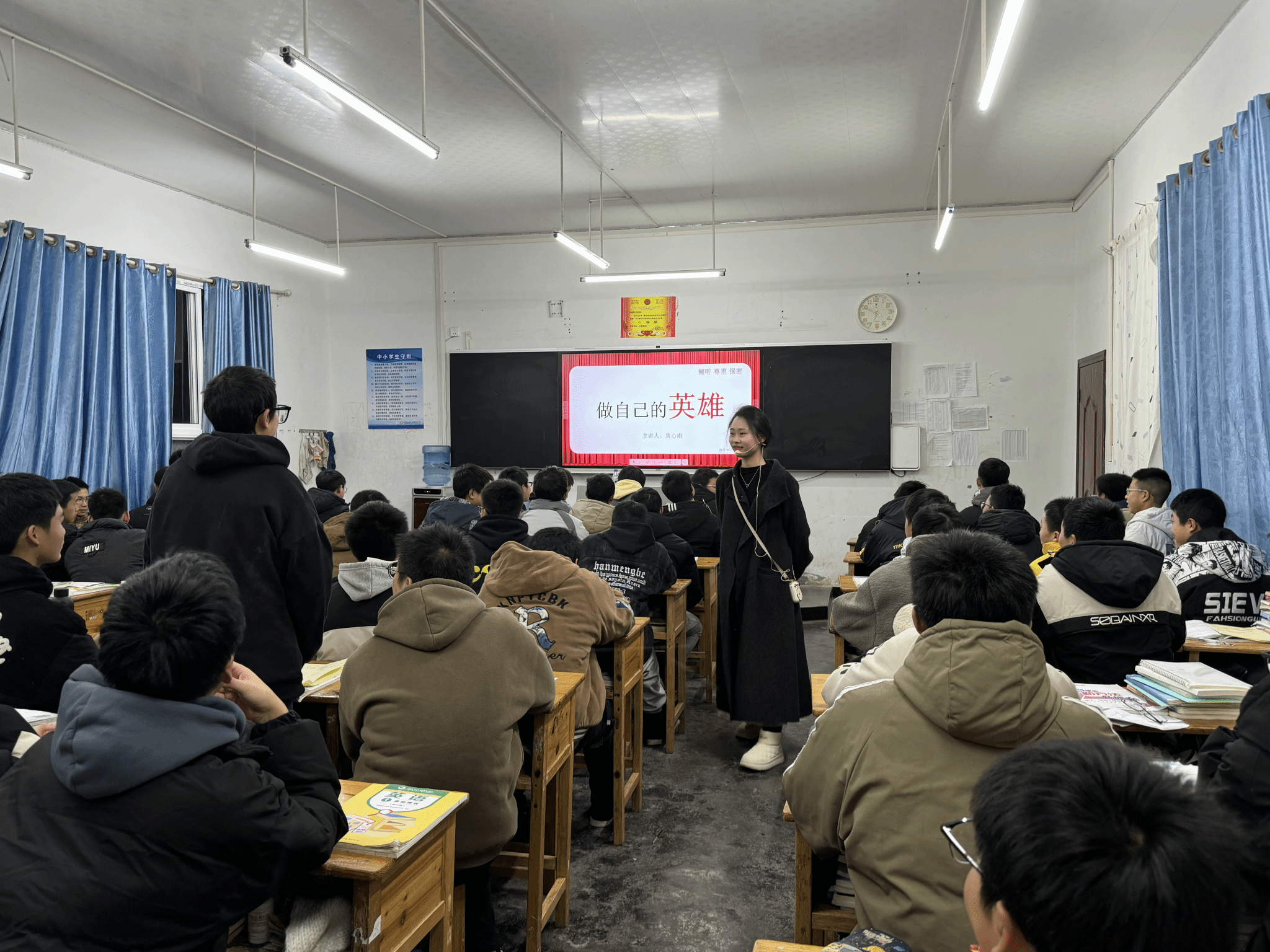 武科大网讯(通讯员黄心雨)为积极响应国家关于加强青少年心理健康教育的号召,助力学生树立正确的人生观、价值观,提升自我调适能力。12月18日,我校第十二届研支团成员曹顶、黄心雨分别在利川市民族中等职业技术学校数控2班、新汽修班开展了主题为“做自己的英雄”的心理健康教育活动。